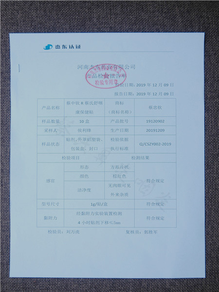 蔡氏舒咽康保健貼檢驗(yàn)報告